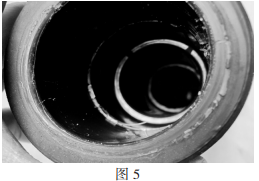 事故分支箱電纜終端所使用的硅脂密封功能不良,故障發(fā)生后,當(dāng)拆撥其它兩相電纜頭時(shí),由于硅脂出現(xiàn)干枯粘結(jié)(如圖5),需要多人合力才干撥出,可見硅脂已不能起到潤滑防潮與絕緣的作用,不能與電纜頭同“呼吸”,彈性功能大為下降。